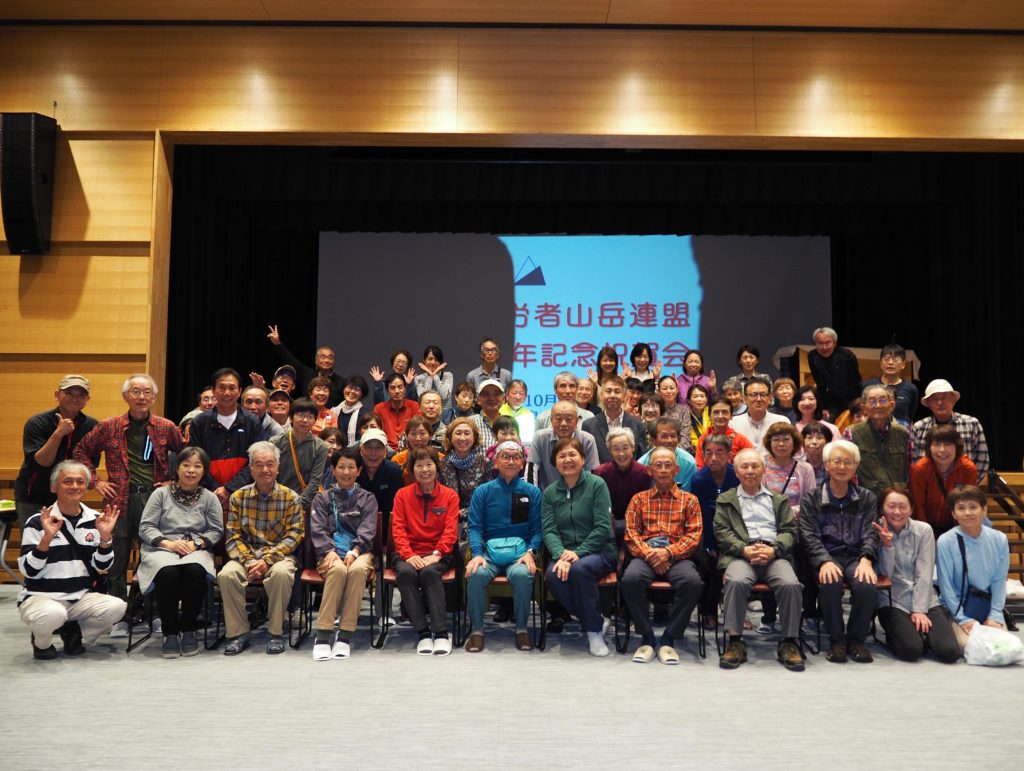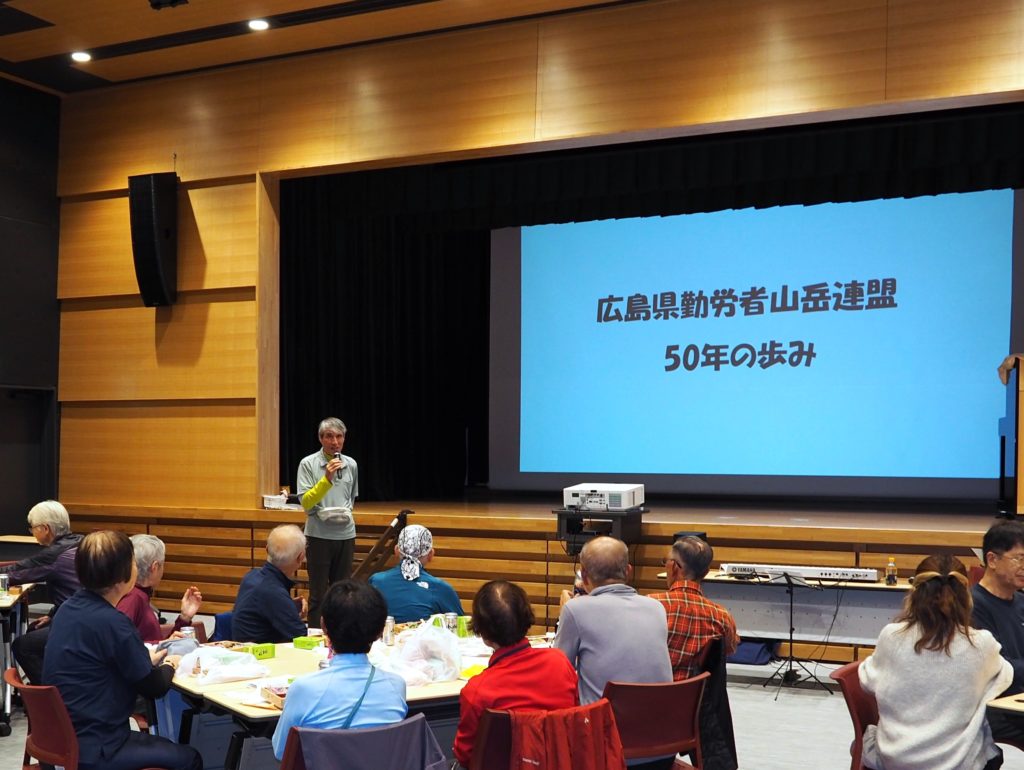 川后さん(やまぼうし)の司会で祝賀会は始まり、まずは、残念ながらここ最近に遭難死された県連会員の方のご冥福を祈り、全員で黙とうしました。続いては県連会長の滝さん(やまぼうし)より、広島県連結成50周年を祝した挨拶をいただき、大藤さん(安佐岳友クラブ)の音頭で乾杯となりました。その後は食事や会話を楽しみながら、安達理事長(佐伯)の解説付きで県連結成以来50年間の歴史や出来事を伝えた映像を楽しく拝見しました。さらに映像は続き、各会の歴史と現状、更に今後の展望などが流されました。懐かしい映像も多く、古参会員の方は大いに喜ばれていたみたいです。永谷さん(やまぼうし)とエレクト-ン演者の方による山の歌のコーラスで締めくくり、二井原さん(呉労山)による閉会の挨拶で祝賀会を閉じました。